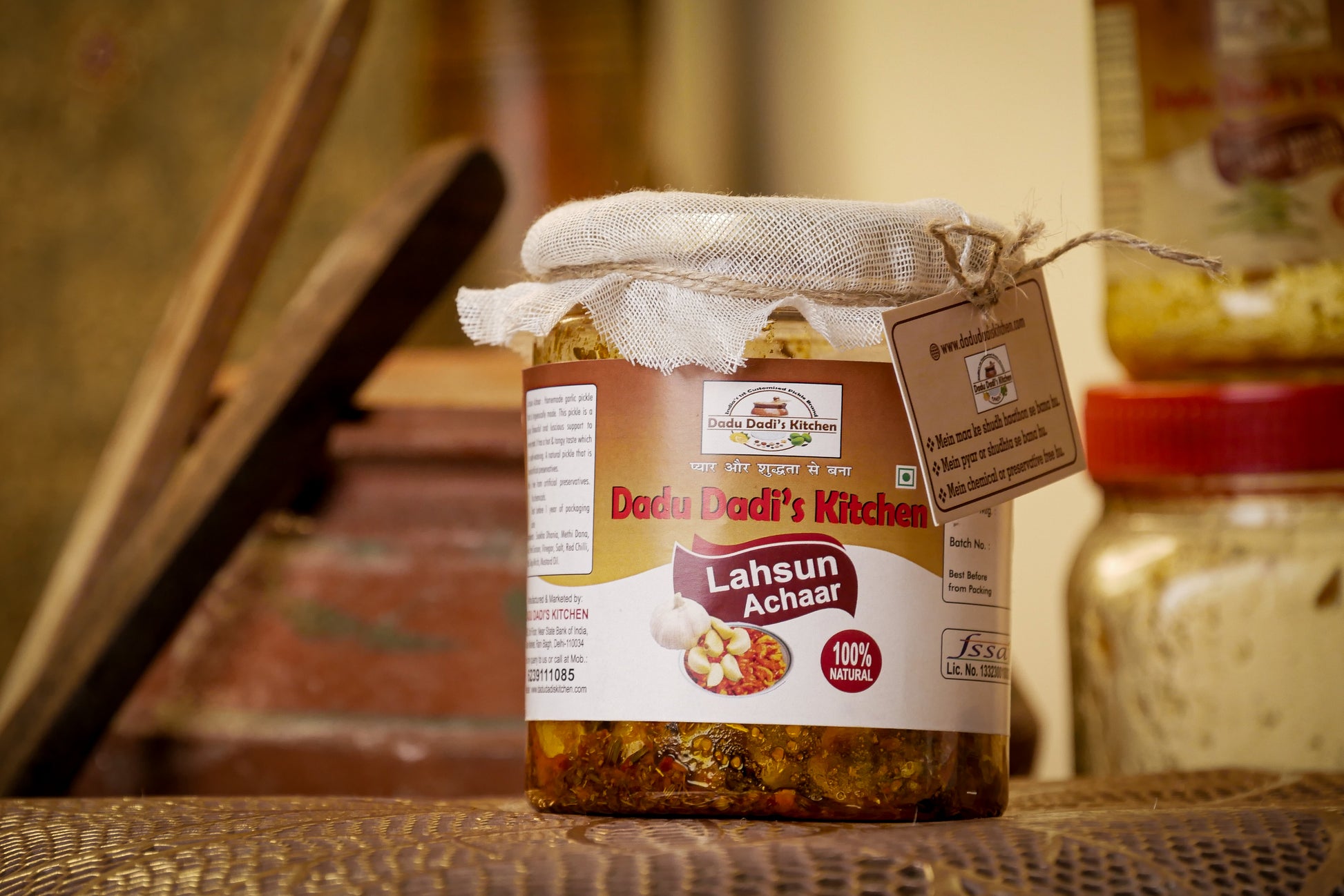 Lahsun Achaar: Homemade garlic pickle that is hygienically made. This pickle is aspicy flavourful and luscious support to every meal. It has a hot & tangy taste which ismouth-watering. A natural pickle that is free of artificial preservatives.