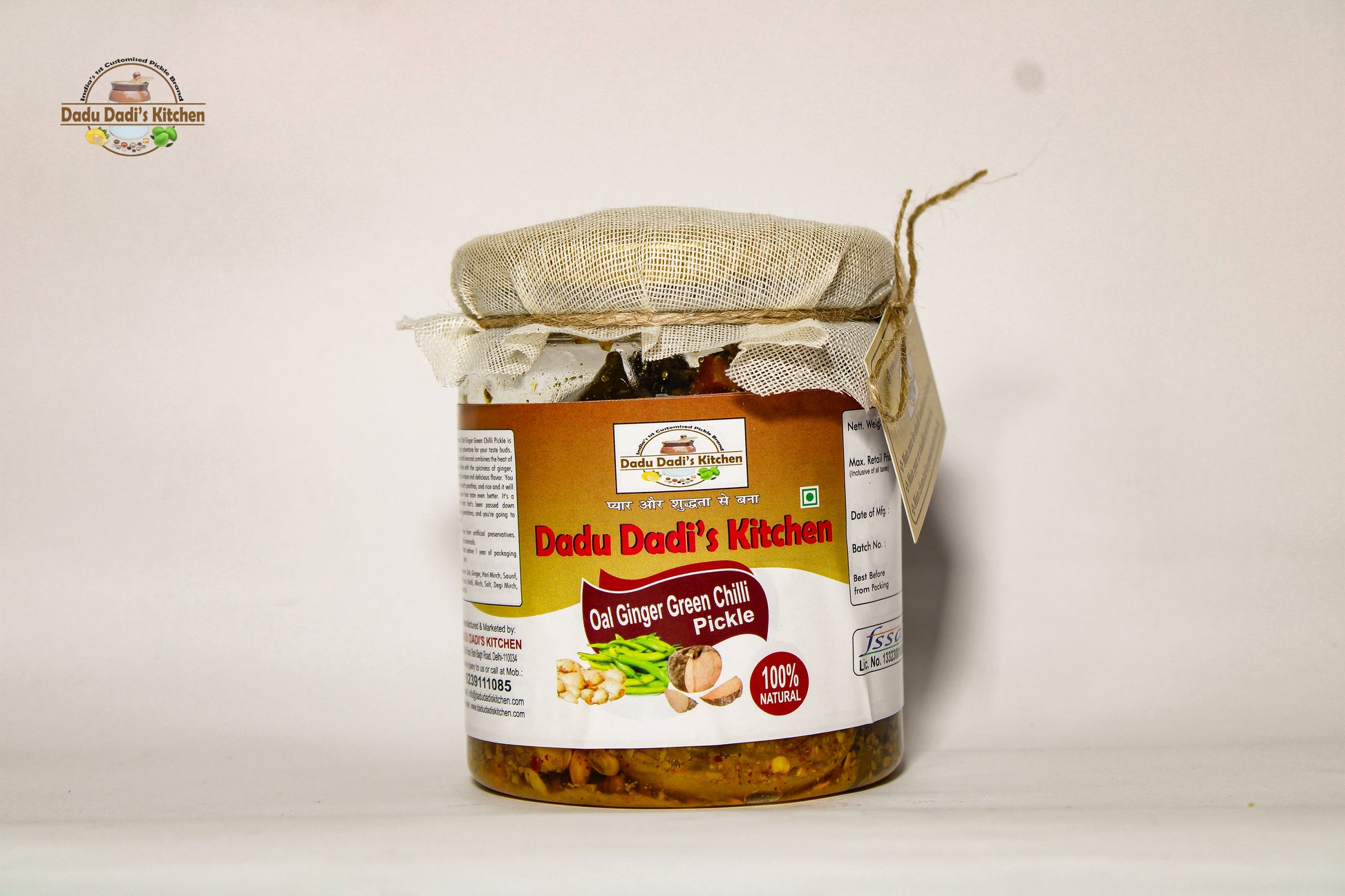 Oal / Hari Mirch : Oal / Hari Mirch with crisp ginger, and mango add freshness to your mood. Spicy, juicy lemon, ginger, and green chili pickle which is ready to eat fresh.